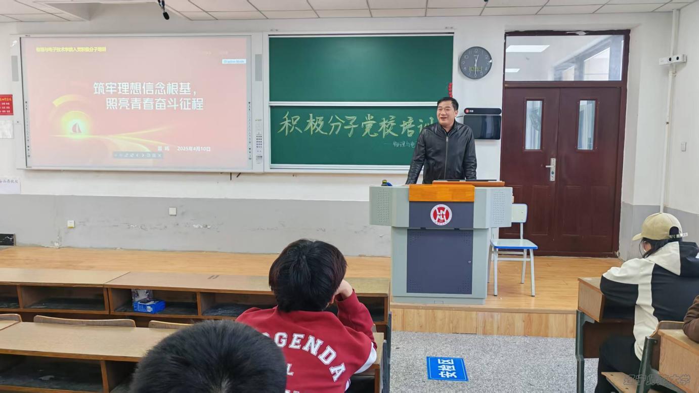 为切实做好入党积极分子培养教育工作,提升入党积极分子思想政治素质,确保党员发展质量,4月8日至4月15日,物理与电子技术学院组织入党积极分子进行了理论学习的集中授课,主要讲解党的性质、最高理想和根本宗旨,党的指导思想、党的历史、党的组织、纪律和作风,端正入党动机、树立崇高理想,以及大学生入党应知应会等内容。重点学习《中国共产党章程》《中国共产党党徽党旗条例》《中国共产党纪律处分条例》、中央八项规定及其实施细则精神等党内规章制度,强化党性教育和党纪教育,督促学员自觉将纪律要求内化于心、外化于行。