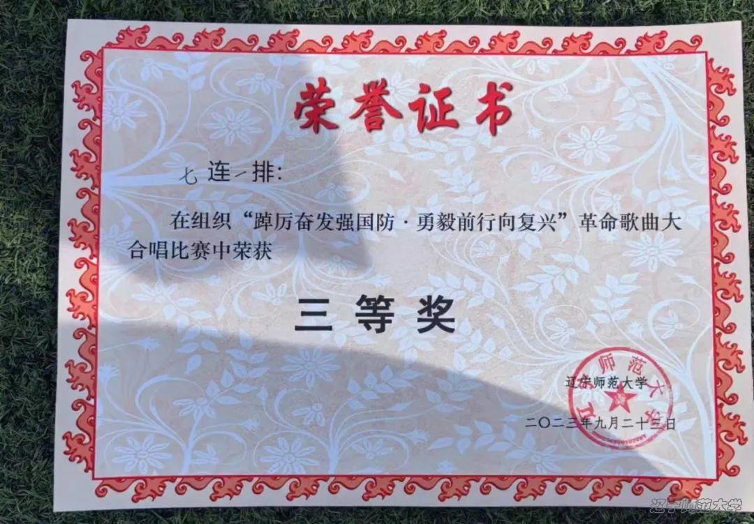 比赛中,在姜贺教官的带领下,我院2023级的同学以挺拔的身影,满载着青春的朝气和新鲜的热血,迈着整齐的步伐走入合唱赛场。“变换队形”随着姜贺教官的一声令下,同学们迅速变换成一个五角星队形,五角星象征着中国人民坚韧不拔的精神和中国必将走向胜利的决心。随后,同学们在姜贺教官的手势指挥下放声歌唱。“听吧新征程号角吹响,强军目标召唤在前方,国要强我们就要担当,战旗上写满铁血荣光……”一首《强军战歌》唱出了同学们对强军目标的不懈追求,也唱出了同学们对践行强军目标的万丈豪情。最后,在红旗的挥舞中,大家以饱满的热情喊出“请党放心,强国有我”的口号,一同敬礼结束了比赛。在此次比赛中,我院2023级新生在军训教官姜贺的带领下,最终取得了三等奖的好成绩。