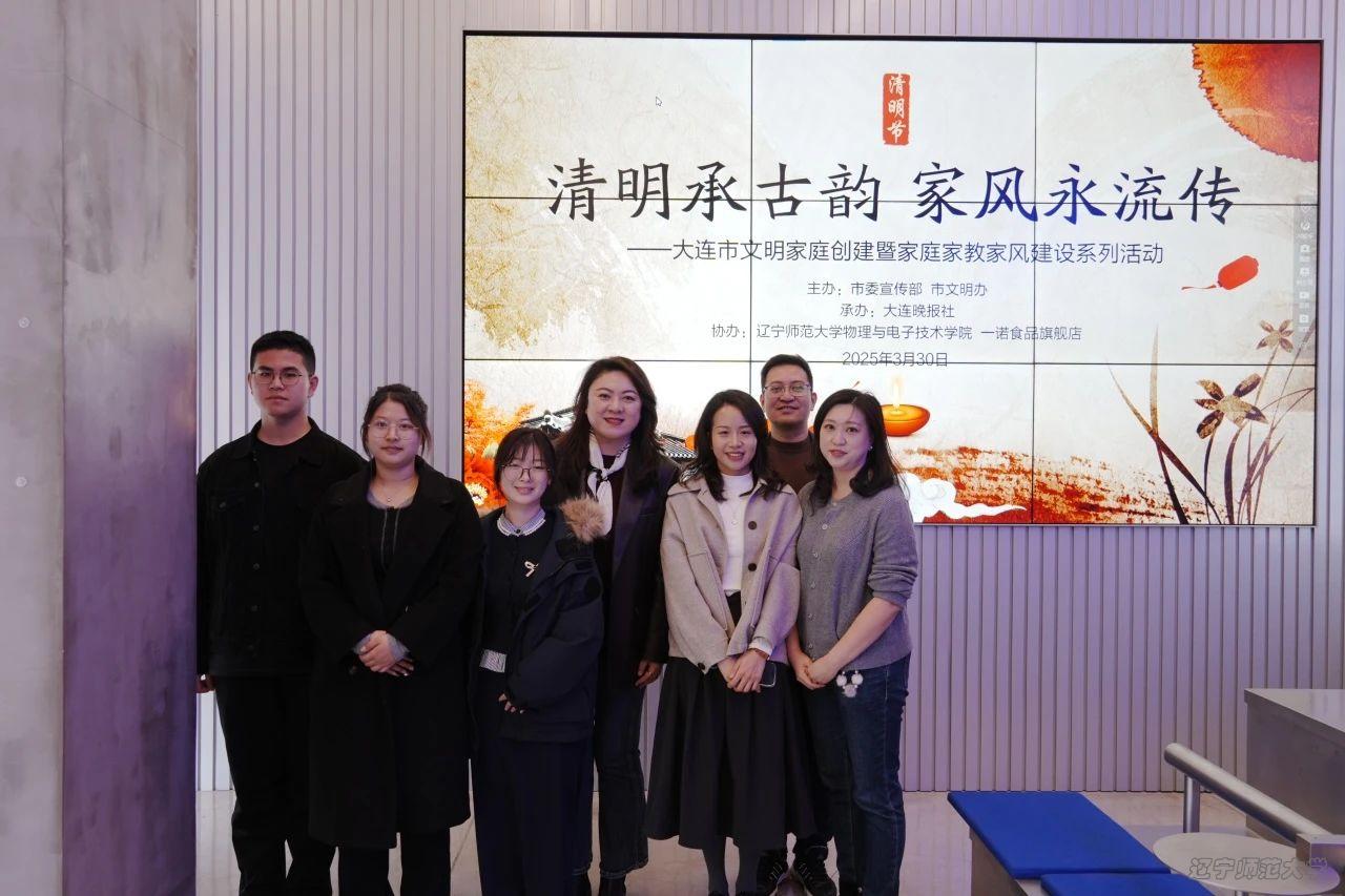 为了让更多人感受传统文化魅力,构建增进和谐家庭关系,同时也为了提升我院学生综合素质,弘扬我国优秀传统文化,3月30日我院与一诺食品旗舰店联合协办了大连市文明家庭创建暨家庭家教家风建设系列活动之“清明承古韵家风永流传”活动,本次活动由市委宣传部、市文明办主办,大连晚报社承办。我院2022级本科生辅导员任美懿老师带队参与此次活动,由2024级物理学师范专业郭译阳、常天宁两位同学进行主讲工作,邹世豪同学进行摄影工作。