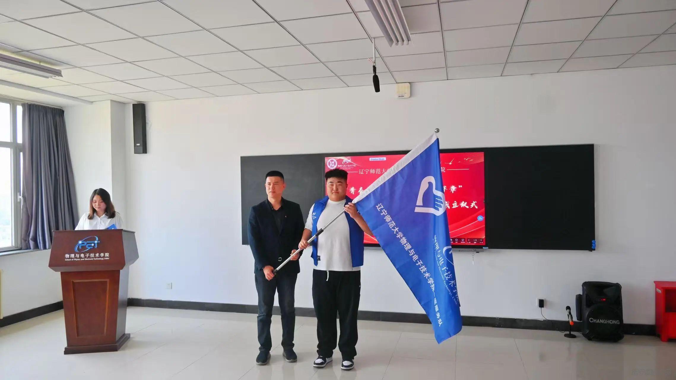 随后,张倩老师宣布物理与电子技术学院志愿服务队正式成立!这一举措意味着学院志愿服务将迈向专业化、常态化新台阶,激励着青年学子以实际行动诠释新时代青年的责任与担当,让青春在奉献中绽放绚丽之花。 孙强老师为志愿服务队授旗,并发表致辞,他表示志愿服务队的成立为同学们搭建了更广阔的平台,鼓励队员们勇担时代使命,积极投身社会实践。然后,志愿服务队队长杨东浩同学表态未来将携手队员们以饱满的热情投入志愿服务,践行五四精神与志愿精神。
