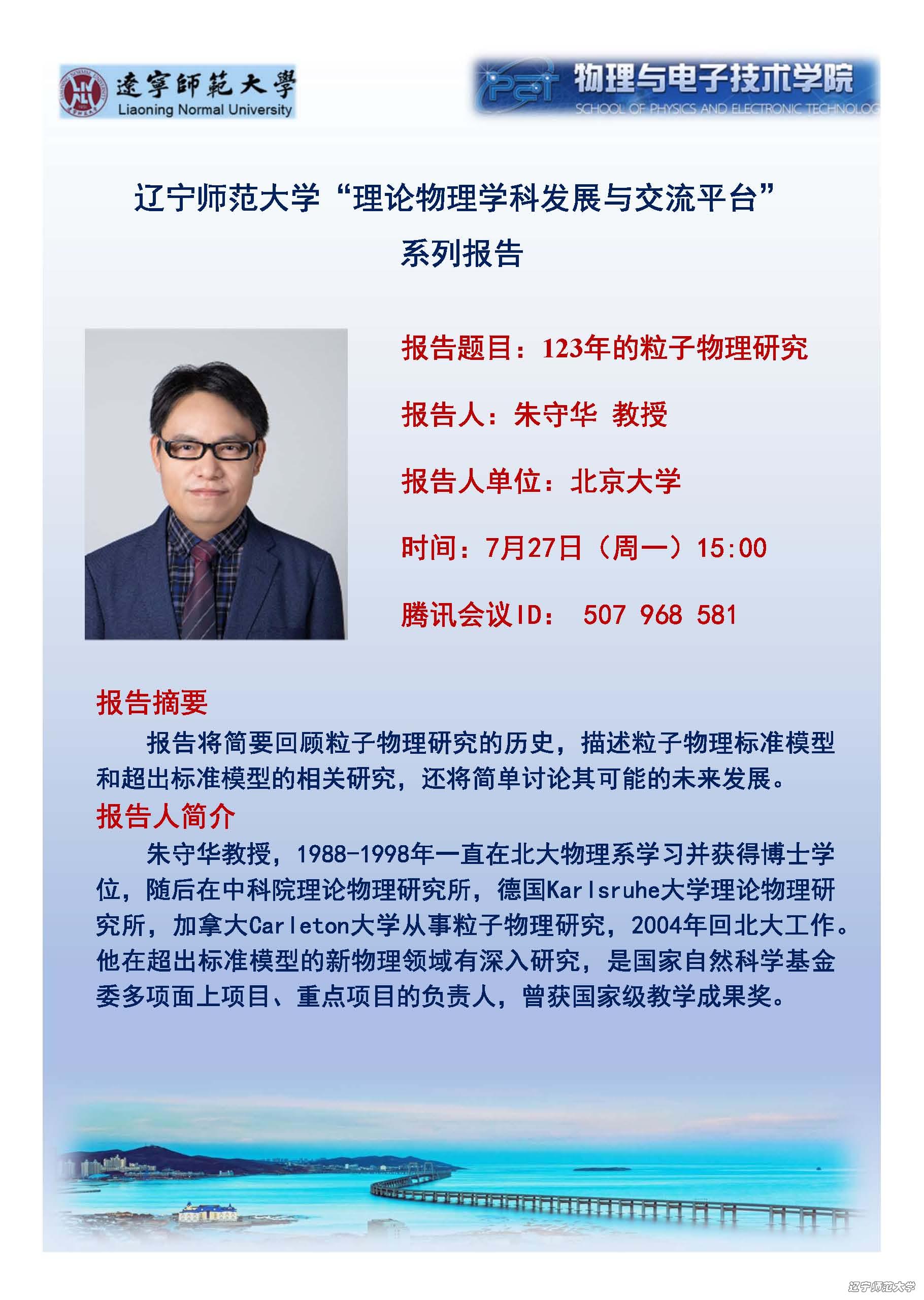 7月27日(周一)15:00北京大学朱守华教授学术报告
