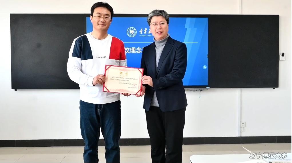 随后,物理与电子技术学院党委书记曲建辉为刘旭老师颁发了《辽宁师范大学物理与电子技术学院研究生职业能力指导教师》聘书。