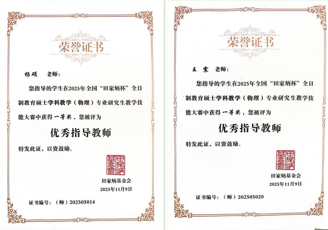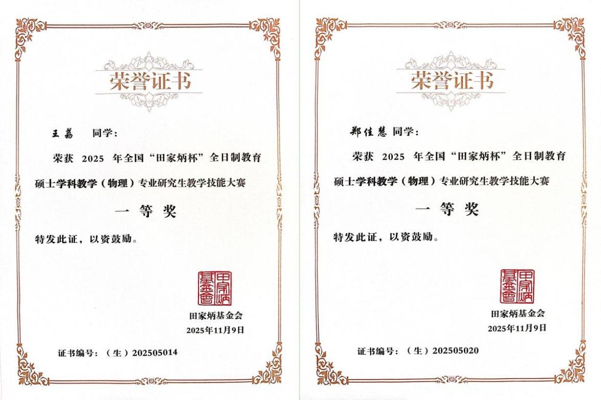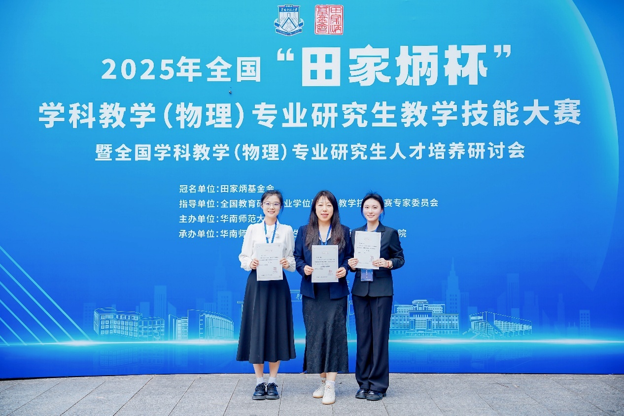 近日,2025年全国“田家炳杯”学科教学(物理)专业研究生教学技能大赛决赛在华南师范大学圆满落幕,物理与电子技术学院2024级学科教学(物理)专业研究生郑佳慧、王荔双双荣获国家级一等奖,王震、杨硕两名教师获评“优秀指导教师”。