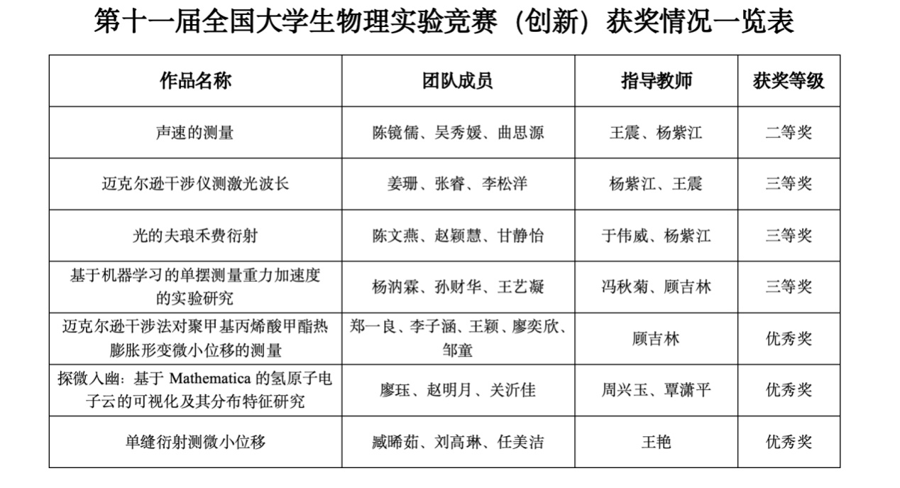 学院领导高度重视此项比赛,自年初组委会发布竞赛通知后,立即针对相关年级本科生开展宣讲动员,为参赛学生选配指导教师,督促和指导师生研究参赛方案,打磨竞赛作品,力求尽善尽美。9月,我院参赛队伍经辽宁省普通高等学校本科大学生物理竞赛选拔确定参加国赛。在最终全国722所高校3260支参赛队伍的激烈角逐中,我院推选的讲课类作品《声速的测量》荣获国家级二等奖,讲课类作品《迈克尔逊干涉仪测激光波长》、命题类作品《光的夫琅禾费衍射》和《基于机器学习的单摆测量重力加速度的实验研究》荣获国家级三等奖,自选类作品《探微入幽:基于Mathematica的氢原子电子云的可视化及其分布特征研究》、命题类作品《单缝衍射测微小位移》和《迈克尔逊干涉法对聚甲基丙烯酸甲酯热膨胀形变微小位移的测量》荣获国家级优秀奖。